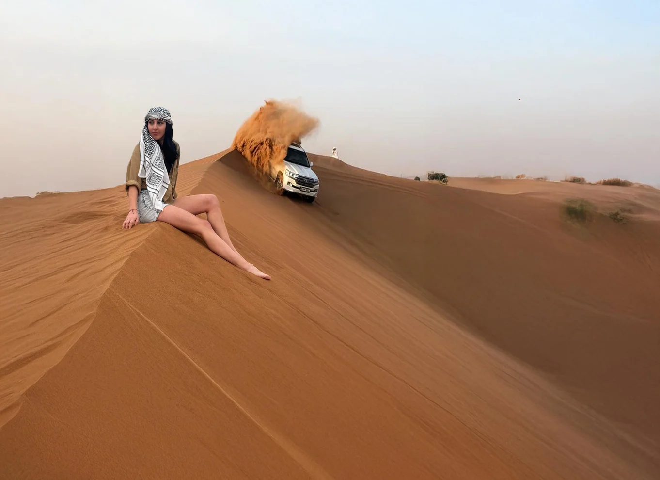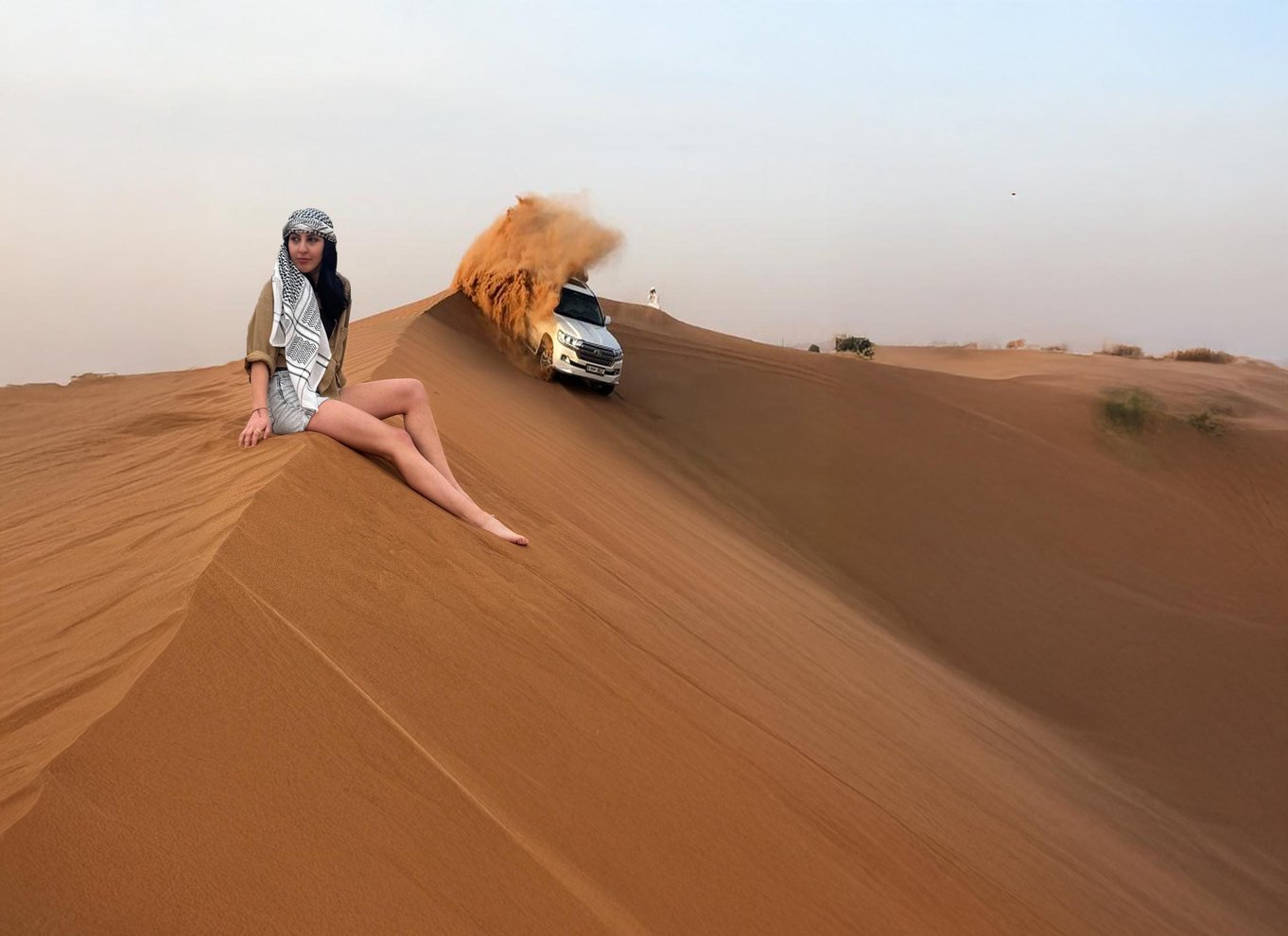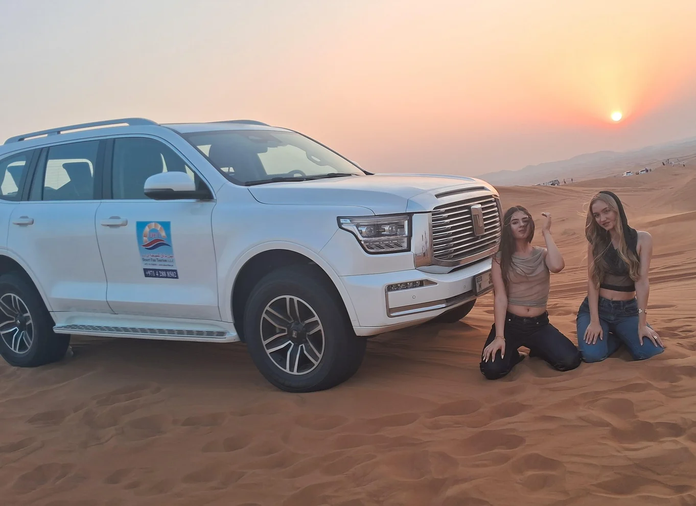 Sosirea în deșertul Lahbab Red Dunes – Bucură-te de priveliștea nisipului roșu frumos în timp ce șoferul pregătește mașina pentru o aventură off-road interesantă.